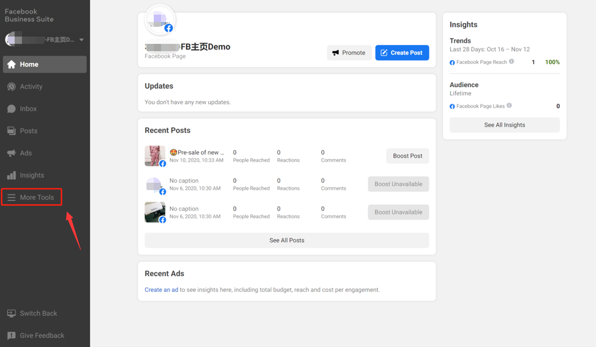 (2)进入主页设置,点左上角,确认一下新建的广告账户是否已经到我们BM: